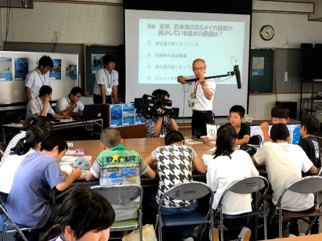 イカは能登町の特産品ですが、海水温の上昇による漁場の変化などにより、漁獲量が大幅に減少しています。このイカを守るため、自分たちが日々の生活から何ができるか、クイズなどを織り交ぜながら高校生が小学生にレクチャーしました。