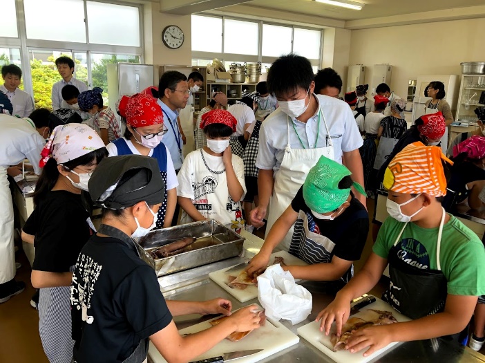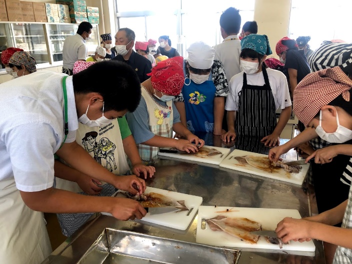 高校生が先生役となり、小学生がイカのさばき方を体験しました。参加した小学生全員が初体験! 普段、よく食べているイカですが、調理をするのは初めてだったようです。