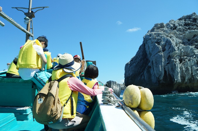 海側から、日本の渚百選に選ばれた「白崎海岸」を見に行きました。目の前に、真っ白の岩肌が迫ってきて、臨場感満点です。また、地元の漁師さんに漁船を出していただいたので、普段は知ることが出来ない、漁業のことも知ることができました。
