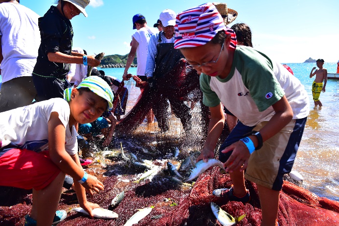 昔から伝わる漁法「地引網」。みんなで網を引きました。終わりには、参加者はもちろん、漁師さんも笑顔満点。みんなで協力して漁業を行うという貴重な体験をすることができました。獲った魚はそのまま、魚さばき体験で、さばいていただきました。