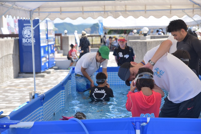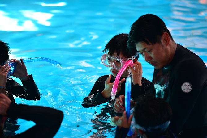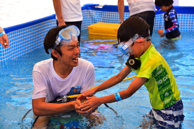 小さなプールと、ダイビングで使うタンクを使って、水中に顔をつけたまま行う「ぶくぶく」体験。小さなお子さんや、スノーケリングなどが少し怖いお子さんも、安心して楽しむことができ、海体験への大切な一歩となりました。