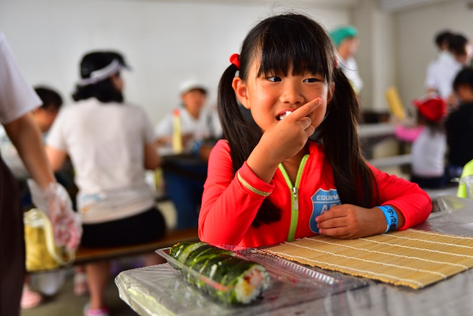 由良町の郷土料理、わかめで巻いた巻きずしを、親子で作りました。わかめでくるくる巻いて、自分で食べるお寿司は、みな格別のようでした。親子で一緒に楽しめるプログラムで、好評でした。