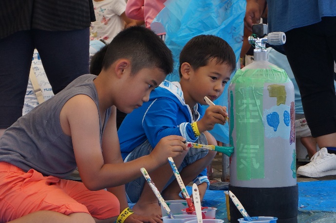 ダイバーが普段使うタンクを自由なキャンパスとして、お絵描きを行いました。魚の絵やメッセージを自由に描けるタンクはここだけの貴重な体験です。また、絵が描かれたタンクは、今後、白崎海洋公園に訪れるダイバーに使ってもらうこととなっています。昨年度、描かれたタンクも大好評でした。