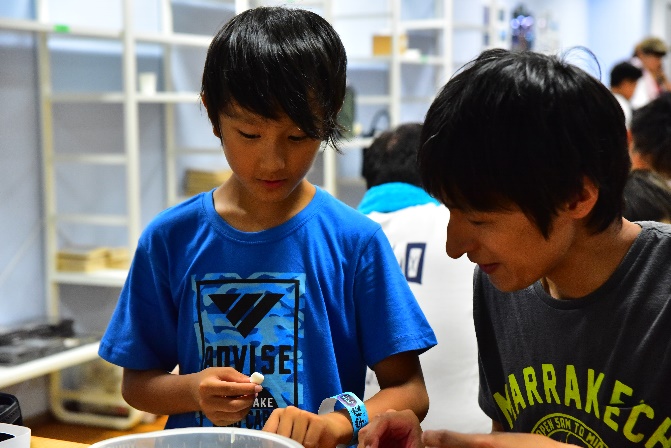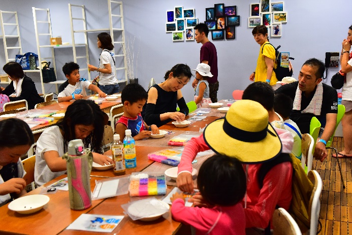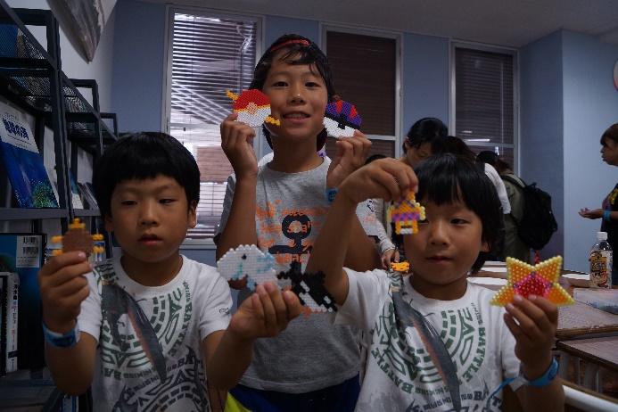 タッチプールで魚に触るのはちょっと怖いかも・・・という小さなお子様でも参加できるプログラムです。ビーズを使って、タコや魚、ヒトデなど、色鮮やかなアートを多くの参加者が完成させていました。