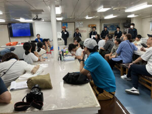 2日目は研修船「望星丸」に乗船。船上での海洋生物の採取や観察はできませんでしたが、海洋に関する講義や船内見学、さらに急遽開催された海や魚に関するクイズ大会を通じて、楽しみながら海の知識を深めました。