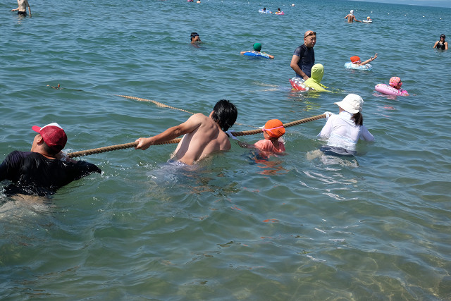 普段は遊泳エリアとしている海水浴場の一部を利用し、子供も大人も一緒に楽しんで遊ぶことができる水中綱引き大会を開催しました。