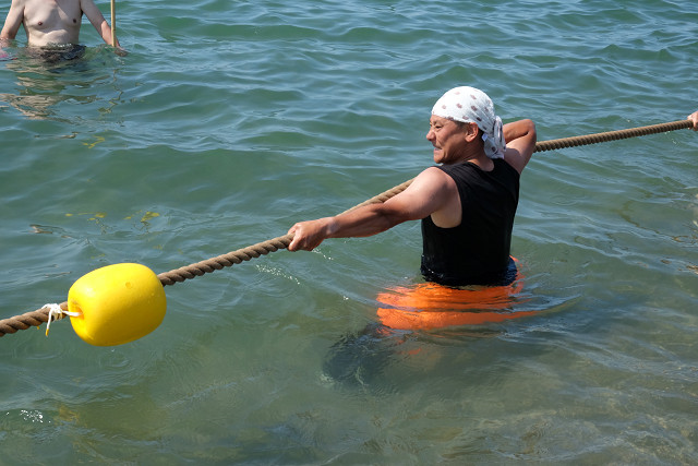 参加者たちは海水の浮力で体が浮き上がることに悪戦苦闘しながらもチーム一丸となって綱を引っ張り合いました。