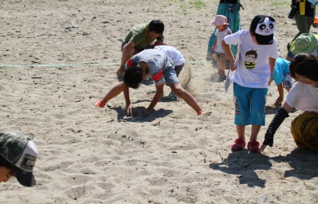 砂の中に、数の少ない特別宝と普通の宝(色を塗った石)を埋め、参加者に見つけてもらうゲームを実施。見つけた人には景品を贈呈しました。