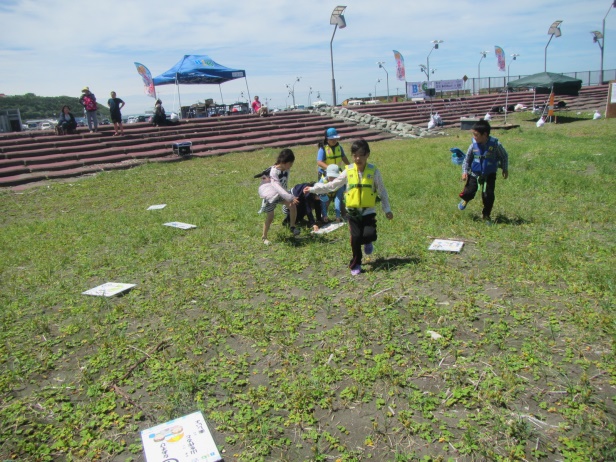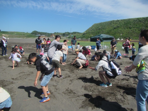 砂の中に、数の少ない特別宝と普通の宝(ともに貝を使用)を埋め、参加者に見つけてもらうゲームを実施。見つけた人には景品を贈呈しました。