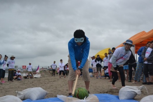 当日拾った貝殻をフォトフレームに使い、思い思いの作品を仕上げました。また、すいか割りはほとんどの子どもたちにとって初めての体験だったようで、すいかに当たった時はみんなとても喜んでいました。