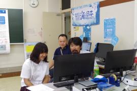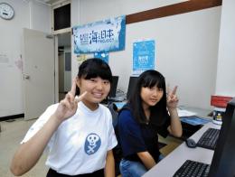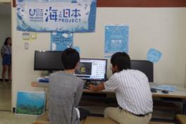 高校生たちはまず、合田浩之特任教授と岡田夕佳准教授から説明を受け、その後、いよいよパソコンの前へ。東海大学海洋学部の学生3人もお手伝いに来ていただきました。高校生たちは年齢の近い学生たちから体験談を聞きながら、用意されていた画像から好きな写真を選び、海絵本を作りました。