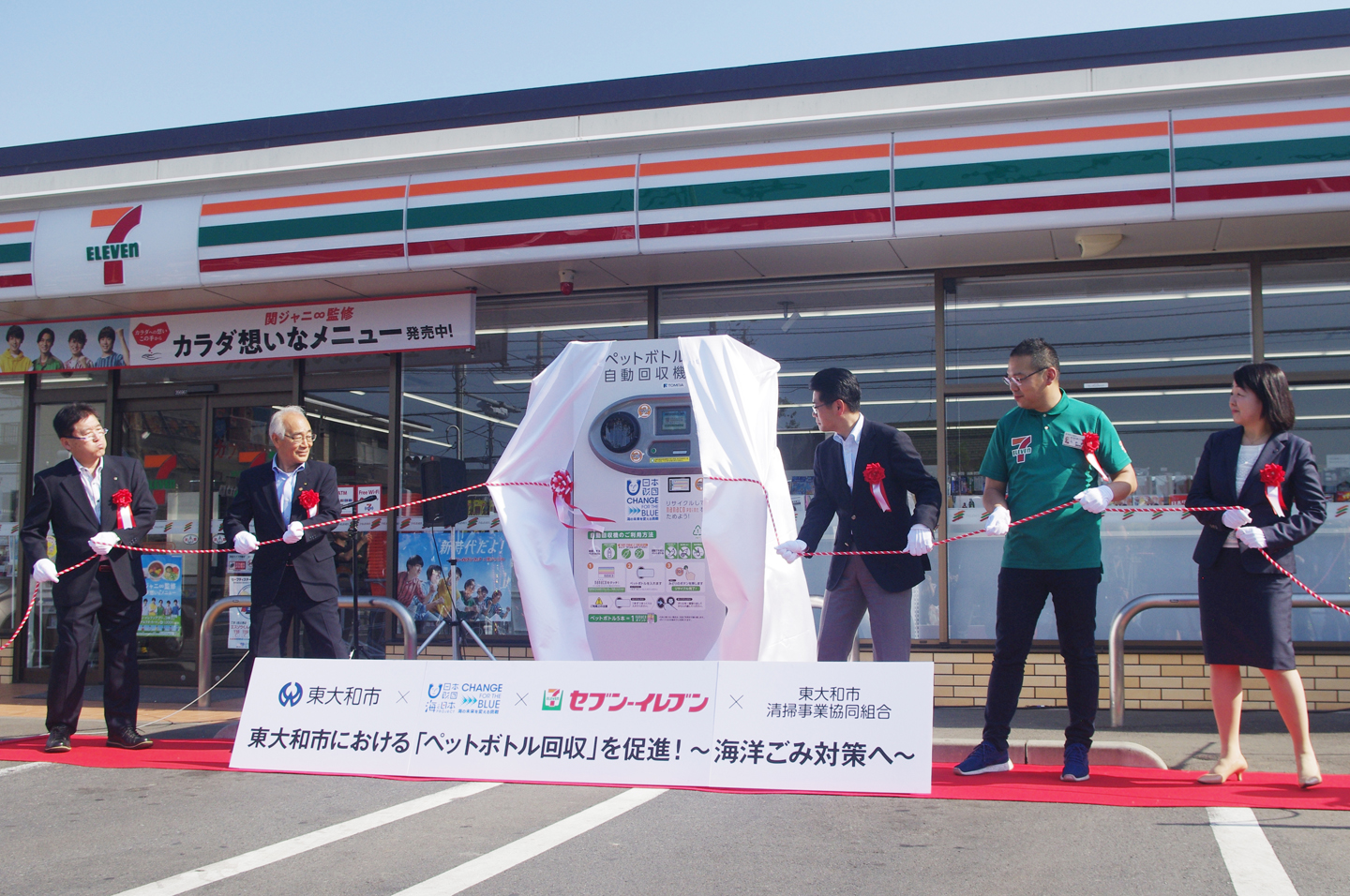 5月23日、東京都東大和市のセブン-イレブン東大和立野3丁目店にて、産官民が連携して取り組む、新たなペットボトル回収プロジェクトの記者発表と、市内全15店舗(2019年4月末現在)に設置される「ペットボトル自動回収機」のお披露目セレモニーが執り行われました。