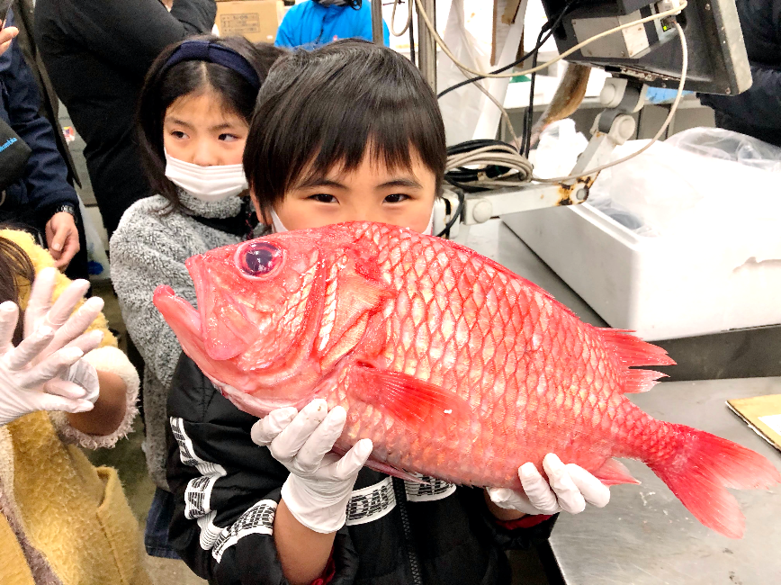 四十八漁場が未利用魚といわれる、獲れても捨てられたりしていて、普段なかなか食卓では目にしない魚を積極的に取り扱っていることから、今回訪れた魚仕分けセンターには未利用魚が多く集められます。センター長からそれぞれ、どんな魚かを教えてもらいつつ実際に魚に触れ、子どもたちは興味津々な様子でした。