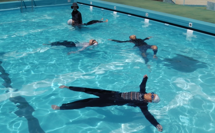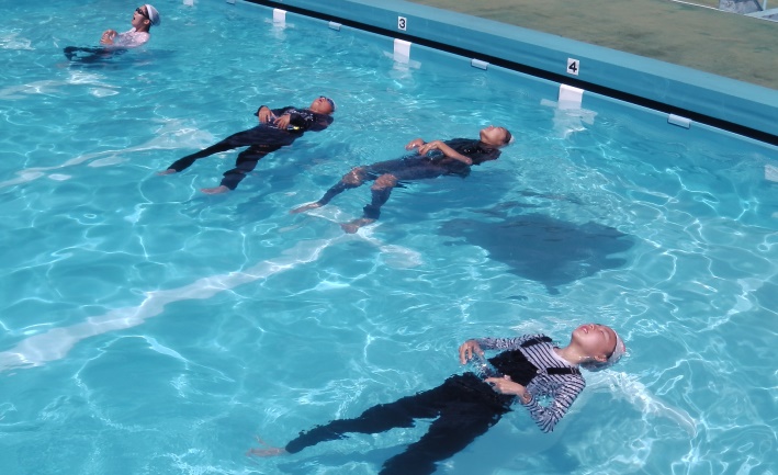 水に落ちてしまった際に、水面上に鼻と口を出して、焦らず浮いて呼吸を確保しながら助けを待つのに適した背浮きを学びました。