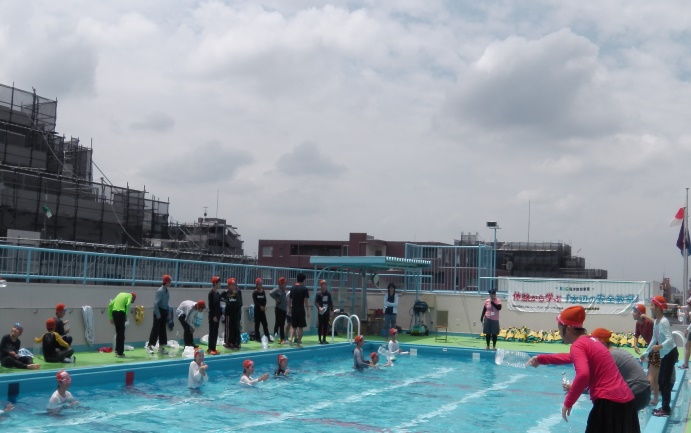 教室では、不意の落水を想定し、ライフジャケット浮遊体験、背浮きや身の回りにある浮くものを利用したペットボトル浮遊体験など、実体験を通して水辺で自分の命は自分で守ることができる知識と技術を身に付けました。