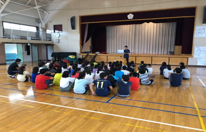実技プログラムの充実を図るため、実技プログラムを実施する前に、紙芝居で楽しみながら座学を行いました。水辺の危険個所や自分が溺れたとき、溺れている人を発見したときの対処法について学習しました。