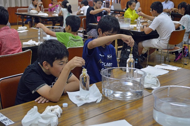 その後、渡辺先生が、錘(おもり)や水槽などを使った実験により、浮力の強さや方向などを説明した後、圧力と浮力の関係を学ぶ最後の実験が行われました。