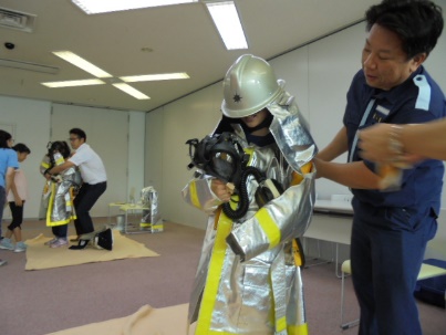 救難業務に従事する潜水士の訓練施設を見学し、救難資機材の着用体験をしました。