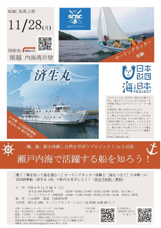 SCBC島風は、瀬戸内海で活躍する船を知ろう!セーリングカッター体験と巡回診療船「済生丸100」の船内を見学