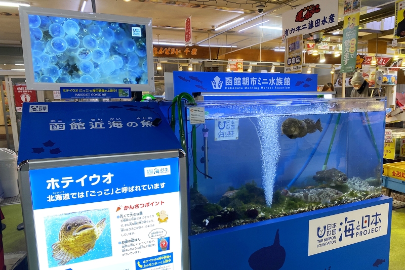 函館朝市ミニ水族館では、ごっこのほか、アイナメ、ホッケなど、函館近海の魚や海の生き物を展示しています。