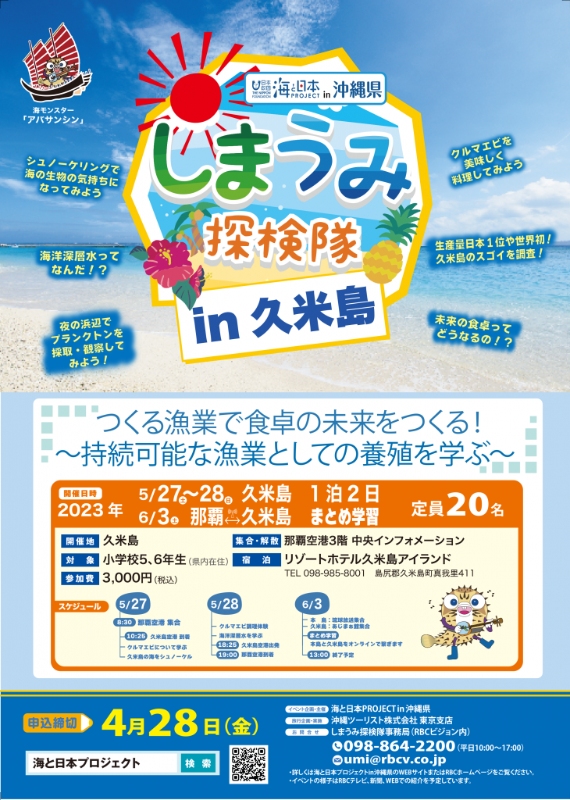 | 問合先 | しまうみ探検隊事務局 電 話 098-864-2200(平日10:00~17:00) メール umi@rbcv.co.jp |