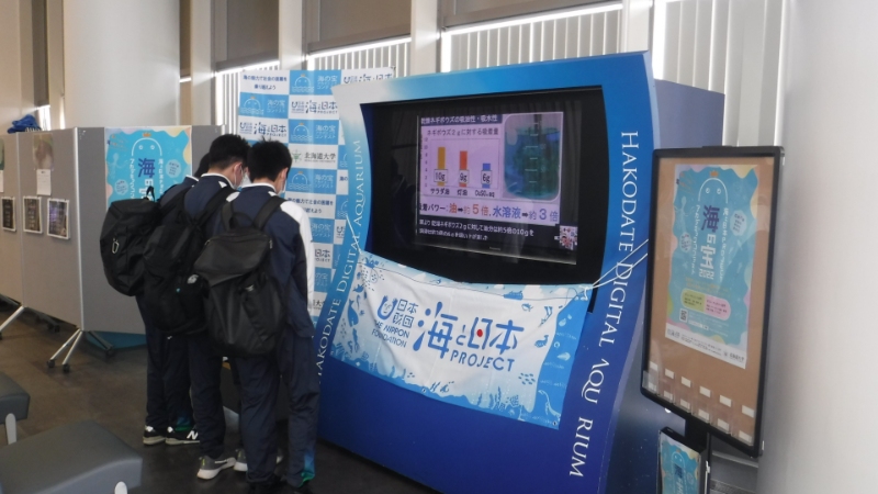 函館市国際水産・海洋総合研究センターのエントランスホールで「海の宝アカデミックコンテスト2022」優秀作品の電子紙芝居(スライド)を動画放映し、来館者に「海の宝アカデミックコンテスト2023」への参加を呼びかける。