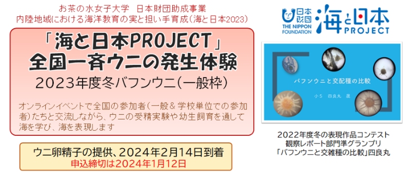 「海と日本PROJECT 全国一斉ウニの発生体験」は、お茶の水女子大学湾岸生物教育研究所が行っている、全国の小中高等学校に海洋教育のための生の素材を教材として提供する事業と、一般向けの体験会とを融合させたイベントです。「全国一斉ウニの発生体験2023年度冬」は冬に繁殖期を迎える「バフンウニ」を用い、教材送付と3種のオンライン会がセットになっています。