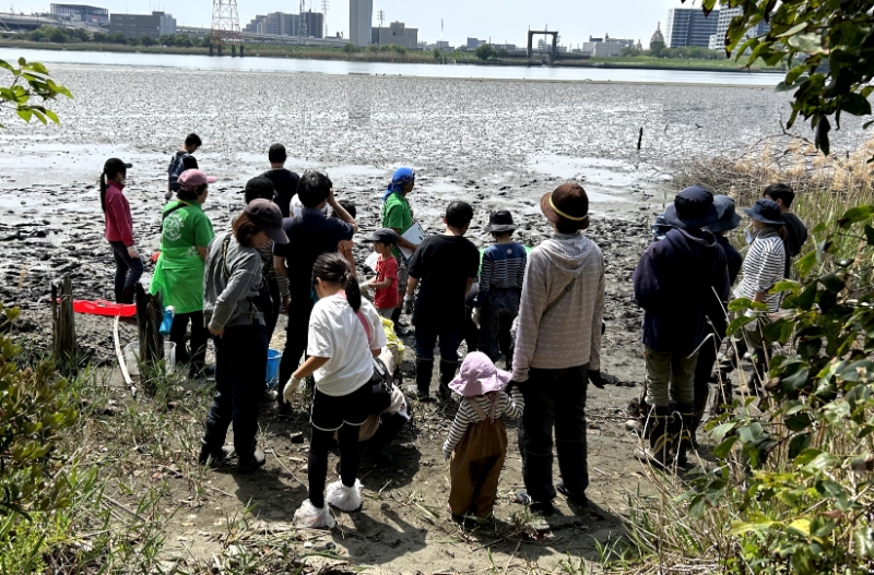 羽田水辺の楽校事務所に集合し、展望台に上がって多摩川の説明を聞いた後に大師橋干潟に入り、いきものを捕まえたり、いきものを観察したりします。その後、状況に応じて干潟のゴミを拾う活動を行います。また、観察会と並行して、大師橋干潟近くの河畔林の清掃活動も行っています。