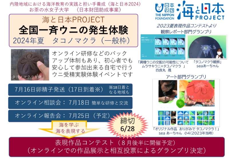 「海と日本PROJECT 全国一斉ウニの発生体験2024年夏」は、お茶の水女子大学湾岸生物教育研究所が行っている、全国の小中高等学校に海洋教育のための生の素材を教材として提供する事業と、一般向けの体験会とを融合させたイベントです。教材送付と3種のオンライン会がセットになっています。夏に繁殖期を迎える「タコノマクラ」というウニを用います。