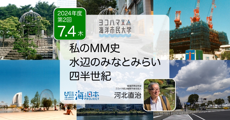 今年11年目を迎えるヨコハマ海洋市民大学実行委員会は、 6月6日(木)より今年度の講座を開始しました。今回の第2回目となる講座では、40年かけてつくりあげてきた横浜市民の水辺のまち「みなとみらい21」を横濱界隈研究家の河北直治さんに改めて語ってもらいます。河北さんは「私が横浜都民となった1989年みなとみらいとの出会いは冷ややかな印象でした。そこは異質な横浜だったからです。YES89以降、MMは変わり続けます。この間、行政やゼネコンの関係者との出会い・ささやかな議論と歴史的背景から導き出されたバブル崩壊後のMMについて近所に暮らすこととなった現在の視点も踏まえ語ってみたい」と言っています。開港からの歴史や行政関係の裏話をまじえた楽しい講座になると思います。
