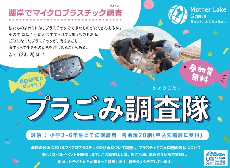 私たちの周りにはプラスチックでできたものがたくさんあります。しかしごみとなったプラスチックが海を汚し、海で暮らす生き物たちを苦しめています。そこでまずは、海とつながっているびわ湖でプラスチックごみの調査をして海洋ごみ削減の問題についてみんなで考えます。参加者は、小学3年生から6年生の子どもたちで、大津、近江八幡、彦根の3ヵ所でそれぞれ調査します。