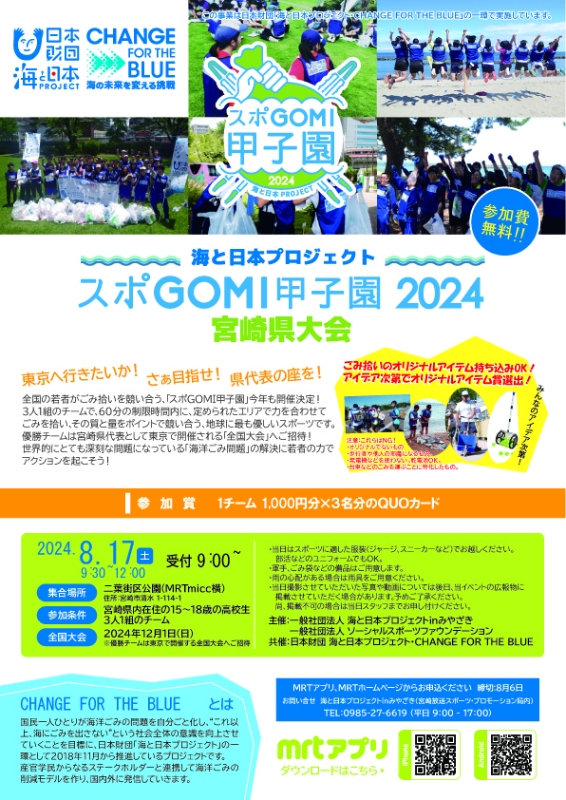 15~18歳の高校生が3人1組のチームを結成し、制限時間60分の中で規定エリア内のごみを拾い、その質と量をポイントで競う『スポGOMI甲子園2024宮崎県大会』を8月17日(土)に開催いたします。