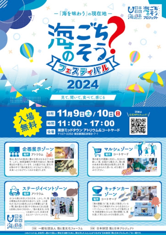 一般社団法人 海と食文化フォーラムは、2024年11月9日(土)、10日(日)に、「食」を入り口に海と人々をつなげるイベント「海のごちそう?フェスティバル2024」を東京ミッドタウン(東京都港区)にて開催いたします。地球温暖化の影響に伴う海水温の上昇、魚種変換、磯焼けなど、近年起こっている海洋環境の変化に適応する知恵として「日本の海の食文化」を今一度多角的に捉え直し、ステージイベント、企画展示、マルシェ販売、キッチンカーなどさまざまな切り口から発信いたします。
