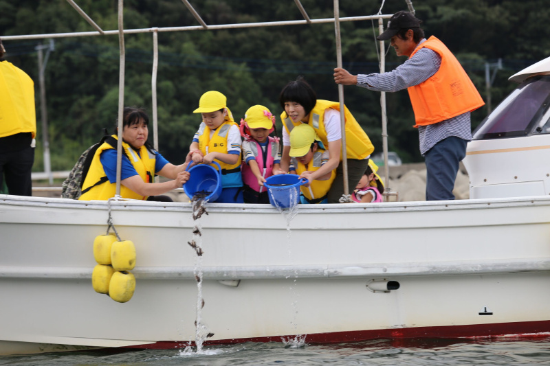 漁師さんから大村湾の生き物や環境の話を聞き、沿岸の清掃活動を行った後稚魚放流を体験し、大村湾の環境の大切さを学びます。