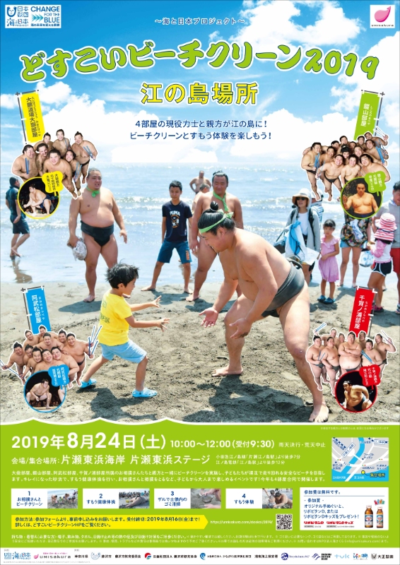 大嶽(おおたけ)部屋、錣山(しころやま)部屋、阿武松(おおのまつ)部屋、千賀ノ浦(ちがのうら)部屋所属のお相撲さんたちと親方と一緒にビーチクリーンを実施し、子どもたちが裸足で走り回れる安全なビーチを目指します。