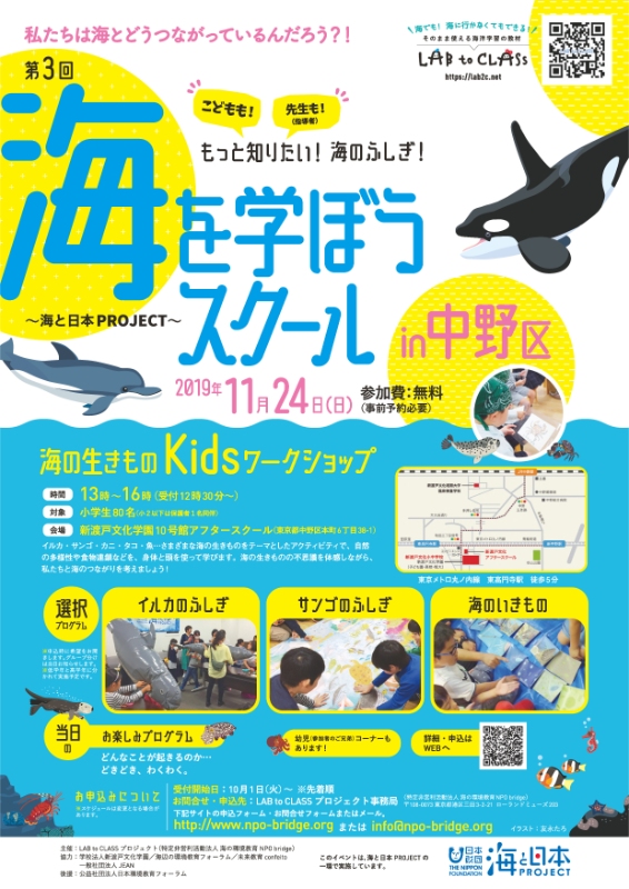 | 問合先 | LAB to CLASSプロジェクト(特非 海の環境教育NPO bridge) http://www.npo-bridge.org /> Email:info@npo-bridge.org |