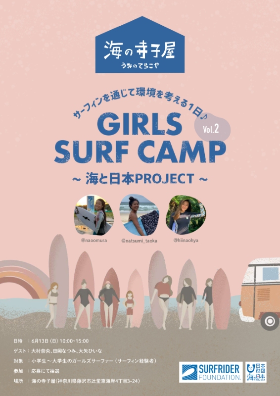 国際環境NGOサーフライダー・ファウンデーション・ジャパン (以下SFJ) のアンバサダーである大村 奈央選手、田岡 なつみ選手、大矢 ひいな選手をゲストにガールズサーファー限定で「海の寺子屋 GIRLS SURF CAMP ~海と日本プロジェクト~」を開催。世界で活躍するSFJ女性アンバサダーと一緒にサーフィンをしたり、ビーチクリーンをしたり、プラごみアートをしたりと「サーフィンを通じて環境のことを考える」盛り沢山な1日となります!小学生~大学生のガールズサーファーを対象に、参加者5名を限定に開催いたします。