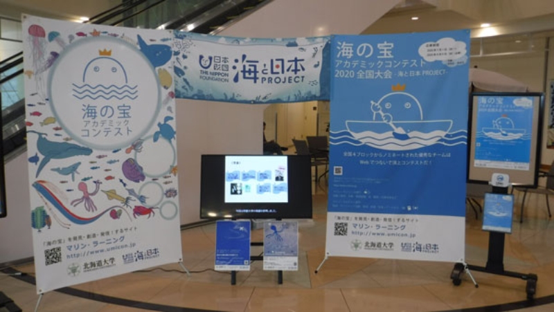 函館空港1F中央ホールで海洋プラスチック等をはじめとする海洋環境問題に関する動画放映および海の宝アカデミックコンテストのPR展示を行い「海」の魅力と課題を考える。