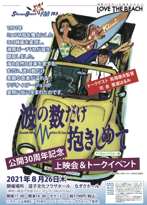 | 開催日付の補足/日程詳細 | ・タイトル 映画「波の数だけ抱きしめて」104分 公開30周年記念上映会&トークイベント ・イベント日時 2021年 8月26日17時開場 18時開演 ・トークイベント 18:00 馬場康夫×晋道はるみ 対談 ・映画上映 18:30 映画「波の数だけ抱きしめて」 ・イベント終了 20:15 |