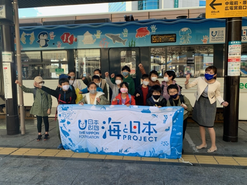小学生が夏休み海で学んだことを新聞と絵にして広電特別電車を飾る!