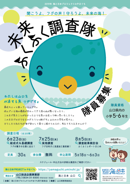 山口県のフグに関する課題を解決する「未来ふくふく調査隊」を結成。山口県を代表する魚、取扱量日本一のフグ。天然ものは乱獲や環境破壊によって減少傾向にあります。プロジェクトではフグを通して海の現状を学び、フグと海を各自アレンジした”フク読本“を作って発信し、海について何を学び、何をすべきなのか志を立てます。