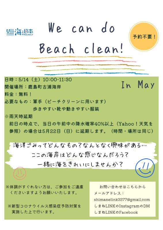 | 開催日付の補足/日程詳細 | 当日のスケジュール 1.鹿島町古浦海岸に集合(10時00分) 2.あいさつ、ビーチクリーンの説明(10時~10時15分) 3.ビーチクリーン(10時15分~11時) 4.ごみの重さはかり・写真撮影(11時~11時30分) 5.解散(11時30分) (雨天時延期:前日の時点で、当日の午前中の降水確率40%以上(Yahoo!天気を参照)の場合は5月22日(日)に延期します。) 持ち物:軍手、動きやすい服装 |