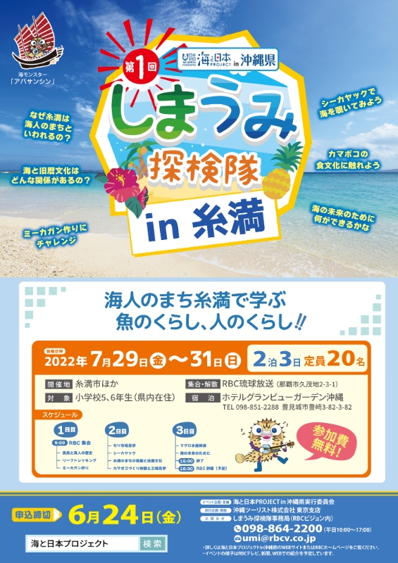 | 問合先 | 海と日本プロジェクトin沖縄県「しまうみ探検隊」係 (RBCビジョン内) TEL 098-864-2200(平日10:00-17:00) メール umi@rbcv.co.jp |
