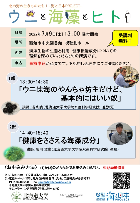 函館市中央図書館で北海道大学教員2名による、海洋生物の生態と利用、健康機能成分についての講演会を行います。