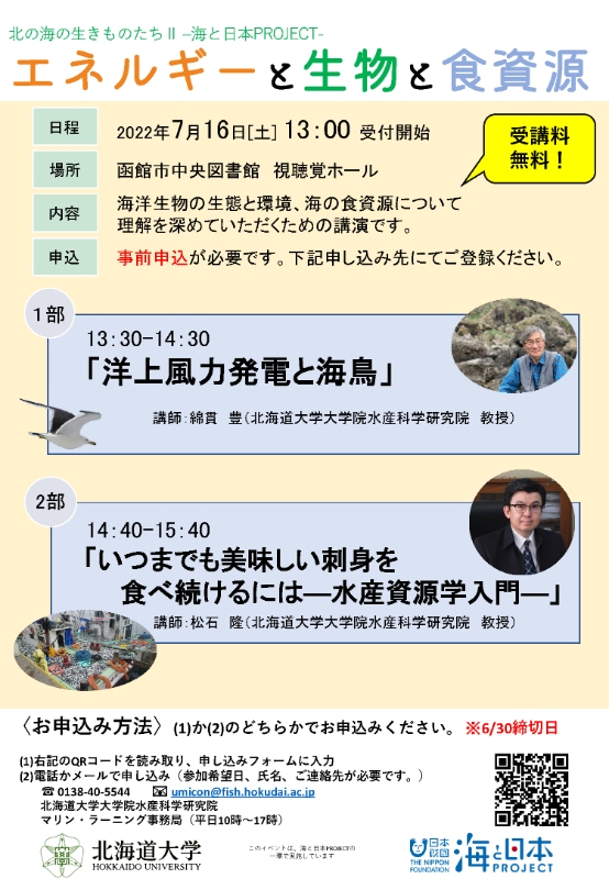 | 開催日付の補足/日程詳細 | 【1部】13:30~14:30 「洋上風力発電と海鳥」 【2部】14:40~15:40 「いつまでも美味しい刺身を食べ続けるには ―水産資源学入門―」 |