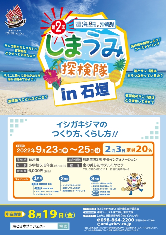 | 問合先 | 海と日本プロジェクトin沖縄県「しまうみ探検隊」係 (RBCビジョン内) TEL 098-864-2200(平日10:00-17:00) メール umi@rbcv.co.jp |