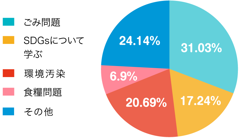 授業の内容は「ごみ問題」が約3割をはじめ、子どものうちからSDGsや環境問題の現状と課題を認識していることがわかりました。「ごみ問題」と選択した児童は、『今問題となっている海洋ごみの量や、海鳥のクチバシに輪ゴムが引っかかって食べ物が食べられず餓死してしまうなど、海の生き物がどんなことで困っているかを学ぶ機会があった』と延べました。また、「地球温暖化」についての学びを述べる回答も多くあり、3Rや二酸化炭素が増えて地球の気温が上がっていることを考えるきっかけがあったとのことでした。