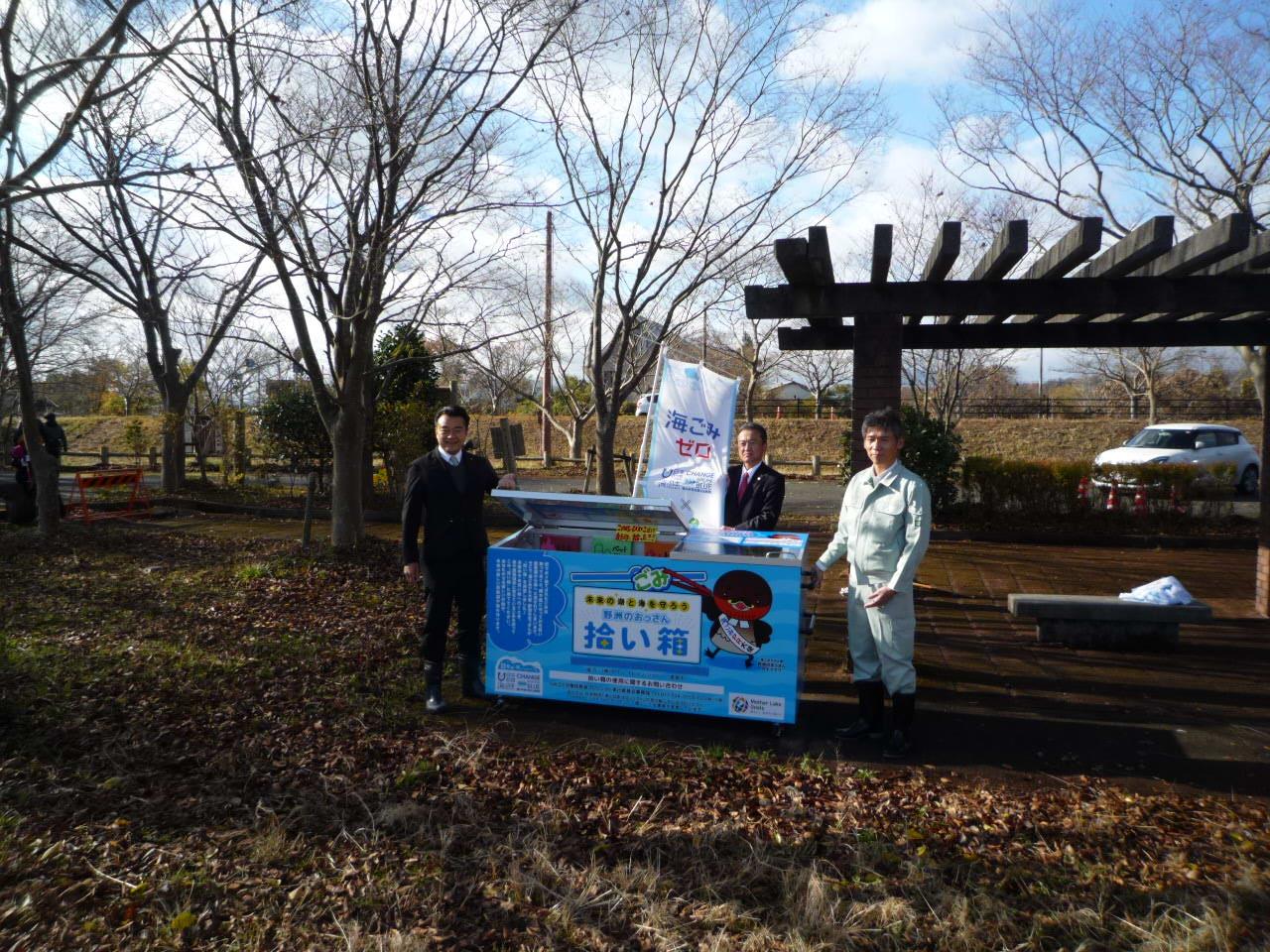 うみゴミ対策琵琶湖プロジェクト実行委員会は、12月5日に高島市の湖岸で行われたヨシ群落保全活動で、今年9月に市内のセブン‐イレブン店舗に試験的に設置した「野洲のおっさん拾い箱」を琵琶湖岸で継続して活用していただくことを目的として、高島市に寄贈しました。
