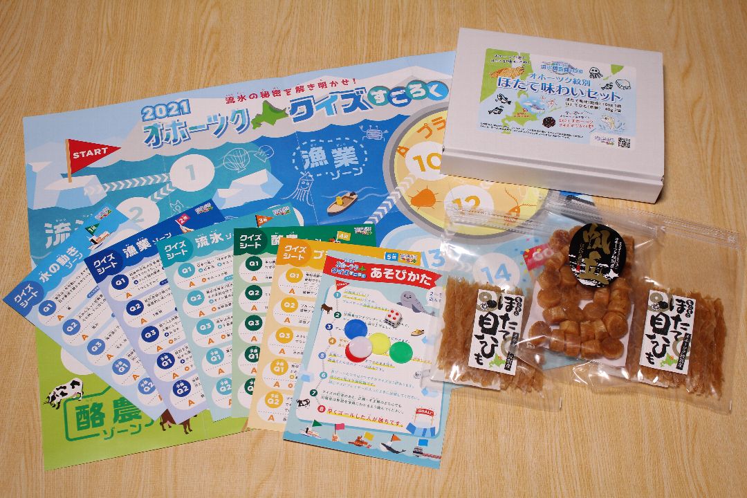 海と日本プロジェクトin北海道実行委員会は、紋別市水産加工業協同組合様と連携し、「オホーツク紋別 ほたて味わいセット」を2021年10月15日(金)から限定発売します。この商品は、ほたて干貝柱(100g 1袋)、もぐもぐほたて貝ひも(40g 2袋)と、オホーツク海のことを楽しみながら学べるゲーム「2021オホーツククイズすごろく」がセットになったもので、紋別市のふるさと納税返礼品としても採用されています。