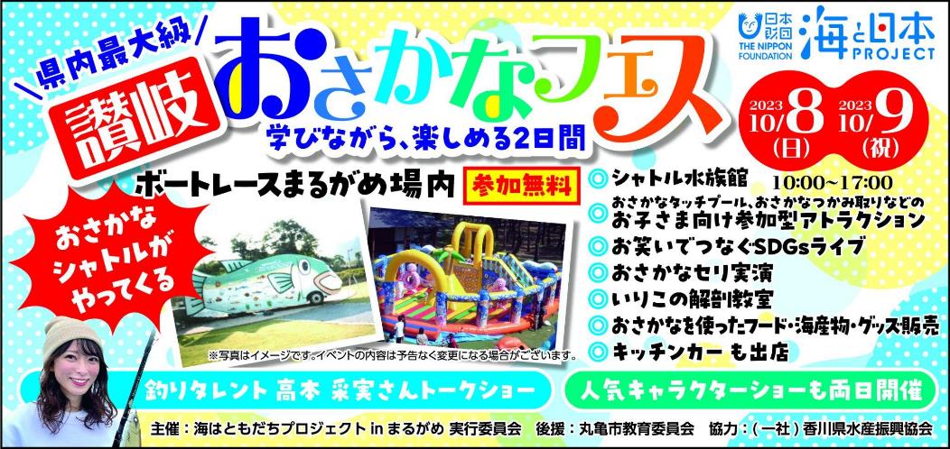 海はともだちプロジェクトinまるがめ実行委員会は、10月8日(日)・9日(月・祝)に「讃岐おさかなフェス」を開催いたします。このイベントは、次世代へ豊かで美しい海を引き継ぐために、海を介して人と人とがつながる”日本財団「海と日本プロジェクト」”の一環です。